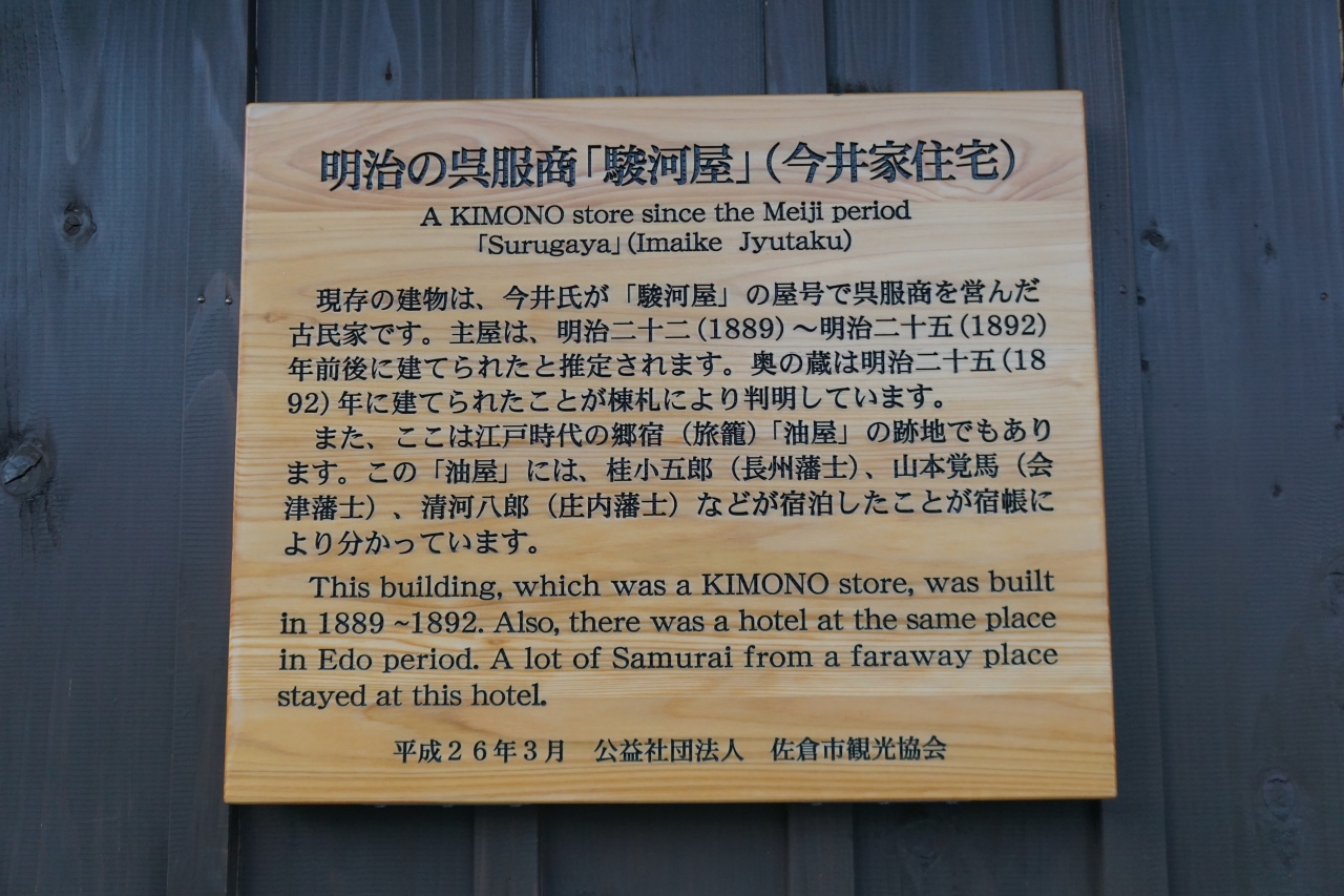 佐倉一里塚は、一里塚というのであれば、土塁があったり、松の木が生えていたりする場所なのかと思ったら、ここは明治時代の呉服商「駿河屋」を利用した施設。壁に建物の説明がありましたが、江戸時代は油屋という旅籠。桂小五郎、清河八郎といった幕末の志士たちが宿泊したこともあったようです。建物は真っ黒な板壁。規模は小さいですが、意外に存在感のある感じです。