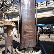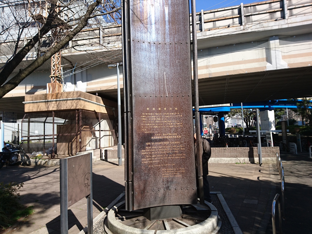 鉄道発祥記念碑は、桜木町駅の野毛側の出口を出て、100mほど関内方面に進んだ場所にあります。褐色の大きな記念碑です。