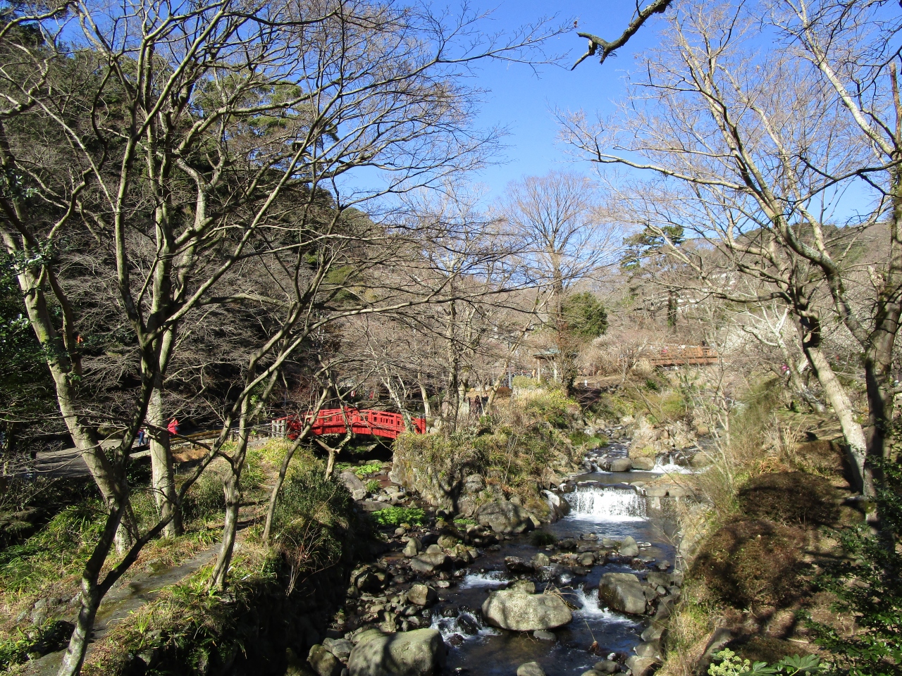 熱海梅園の真ん中に、ちょうど2分するように細い川が流れています。この川の途中に三か所ほど橋がかかっていて、熱海梅園の美しい景色を作っています。川の上流(梅園の奥)は滝のようになっていて、きれいな眺めです。