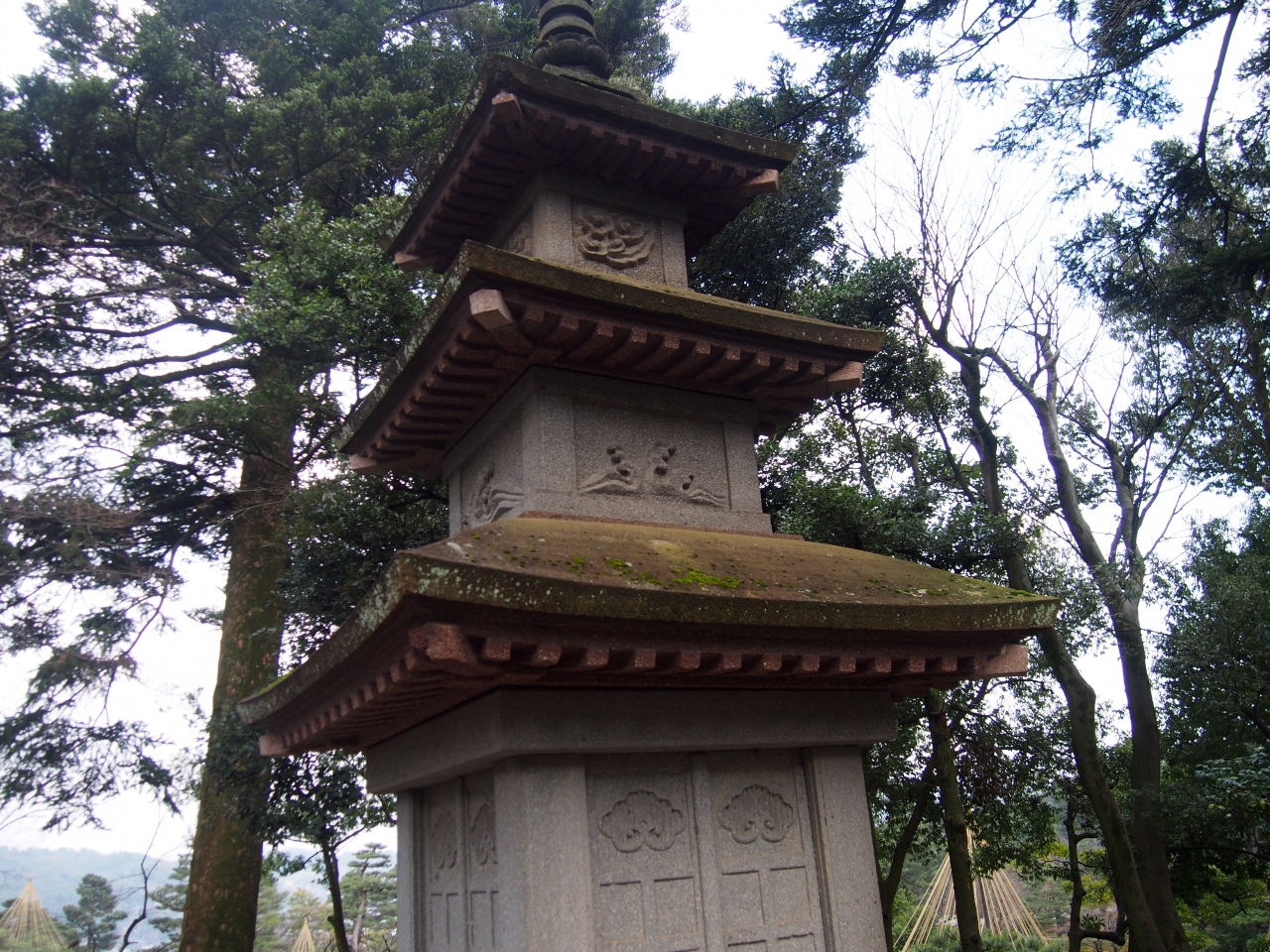 兼六園内なる霞が池の南側にある栄螺山の山頂付近にある塔が三重の宝塔です。第12代加賀藩主である前田斉弘の供養に建てられた石塔です。宝塔は6m大の大きさで山頂部の狭い場所に建っているので、写真を撮るときには苦労があります。宝塔の近くは霞が池がよく眺められるスポットです。