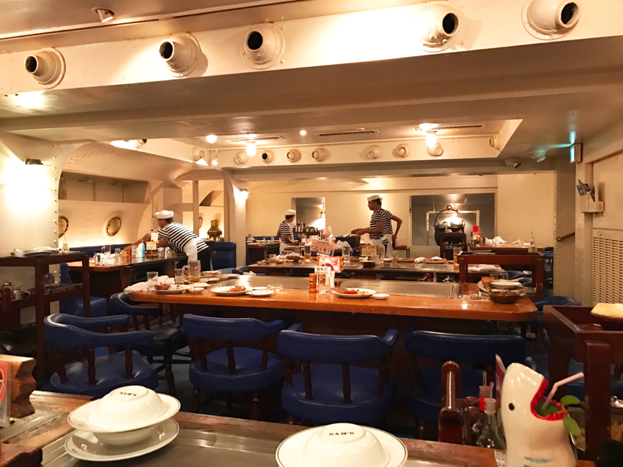 店内は旅客船を彷彿とさせる造りになっていて、スタッフ(ほぼ外国人)はコスプレのセーラー姿で楽しませてくれます。