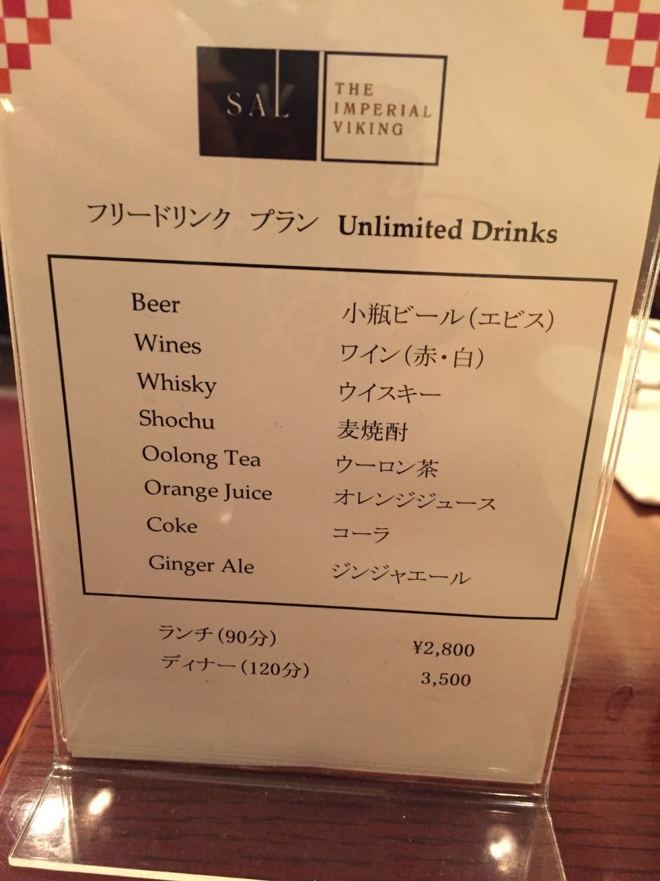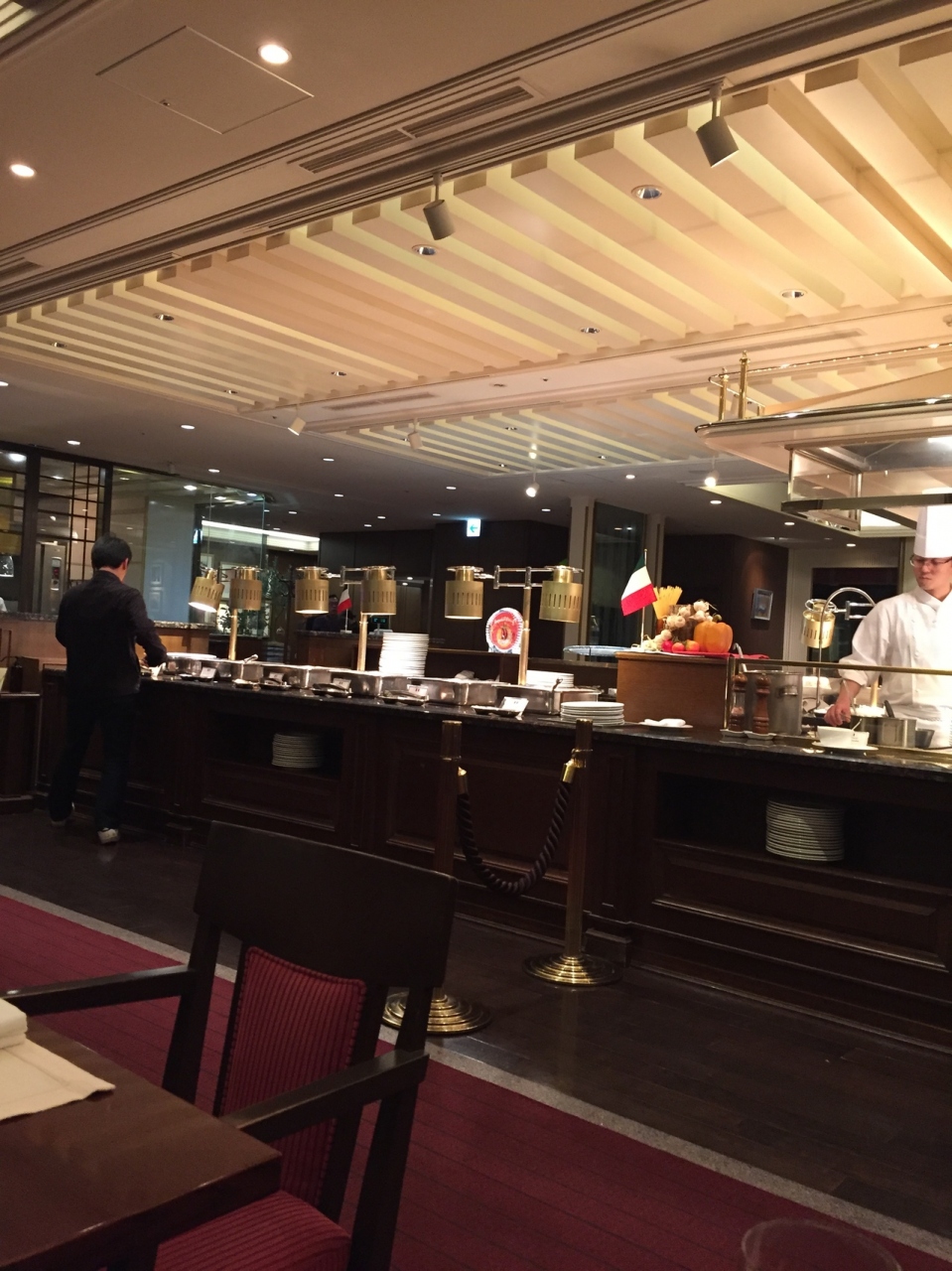 1人9200円ぐらいで、コーヒー、紅茶は含まれています。他の飲み物は有料ですが、飲み放題は3500円とお得です。私が行った時はイタリアンフェアでしたが 前菜、パスタが3種類、魚料理は2種、リゾット1種に、通常料理の感じでした。しかし 何にしろ料理の質は高いにしろ、種類が少なく残念です。デザートは種類がまあまああります。