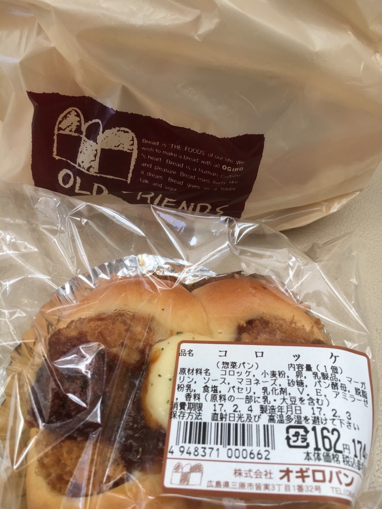 地元のパンで有名なオギロパンを買ってみました。イチゴ味とか瀬戸内レモン味、あんことかコッペパンの種類は多いんですが、総菜パンは少なかったです。コロッケパンにしました。コロッケはホクホクでしたがパンの生地がもう少ししっとりしているほうがいいと思いました。