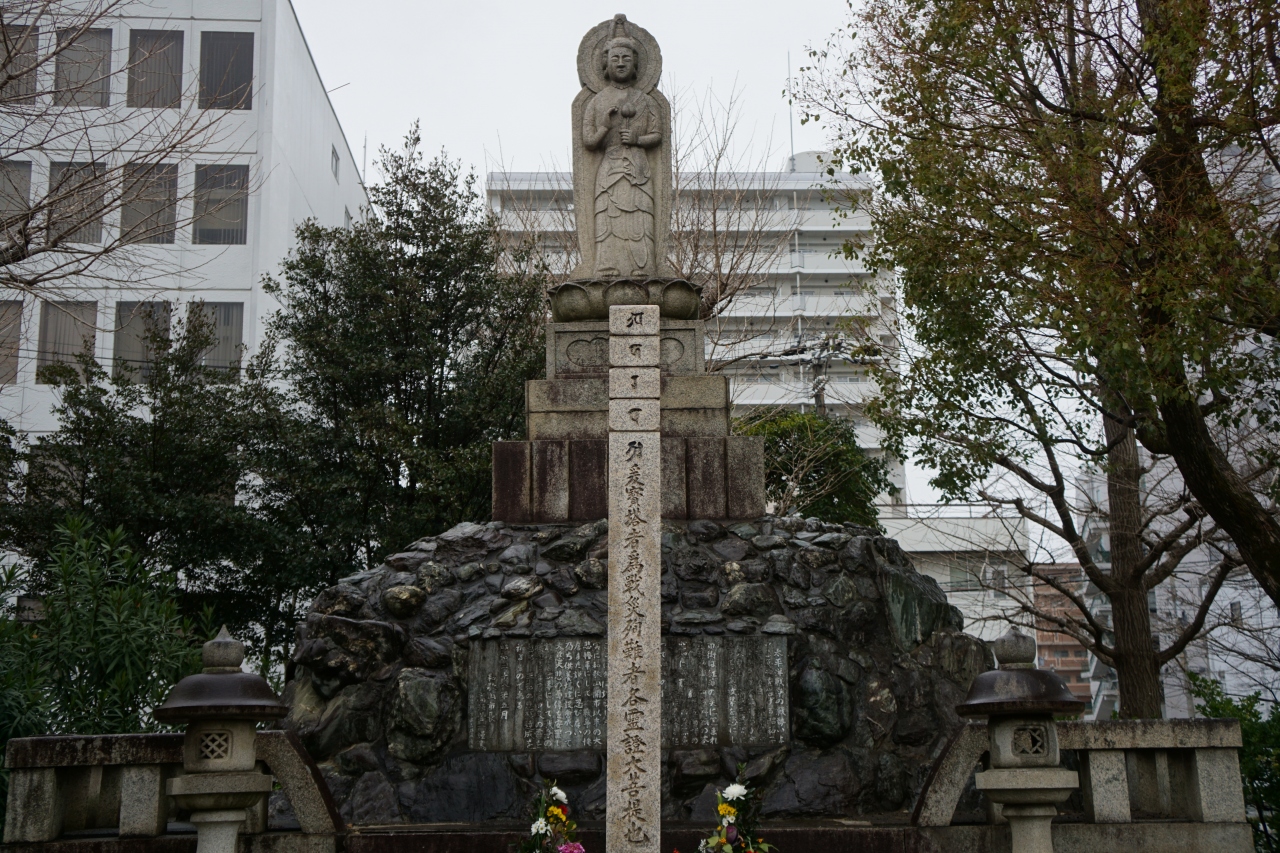 和歌山市街の目抜き通り沿いにある汀公園には、戦災殉難者供養塔があります。これは、太平洋戦争で和歌山市が空襲を受けた時に犠牲となった700名以上の慰霊のためのもの。正面の碑文には惨事の様子とともに平和の大切さが書かれています。