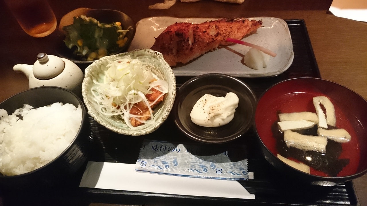 ビルの地下にある、夜は水炊きが食べられる居酒屋さんです。ランチメニューは6種類。「赤魚粕漬け定食」を頼んだら、メインの大きな赤魚の他にサラダ、ポテトサラダ、唐揚げ2個、味海苔が付いてました。もの凄いボリューム。お店を出るときには行列が出来てました。