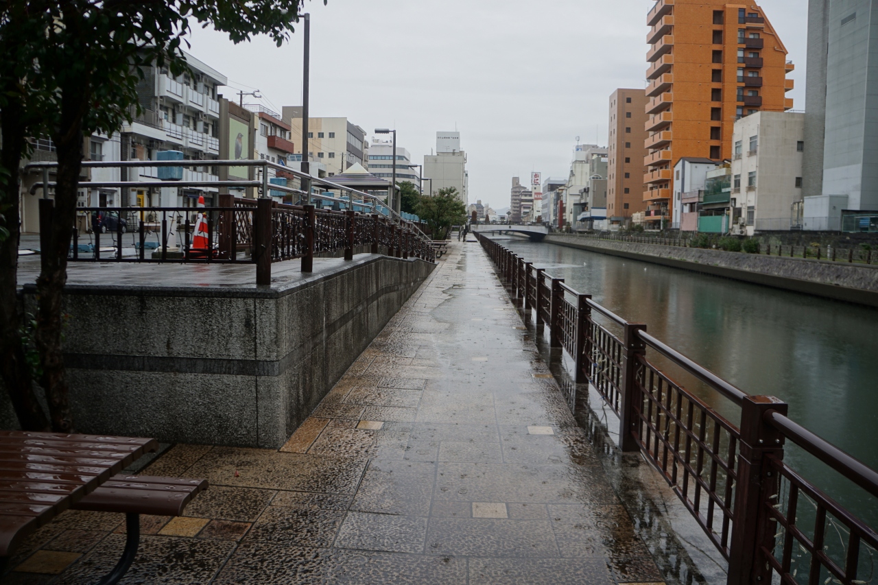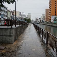 市堀川遊歩道は、和歌山城の北側市街に流れる市堀川の両岸に整備されたもの。ここは、和歌山城下の河岸もあった場所なので、江戸時代から人の往来が活発だった場所です。歩道は石畳の風情ある造りですが、ビルの真裏のような寂しげな場所もあって、ちょっと道頓堀にも似ているような気がします。