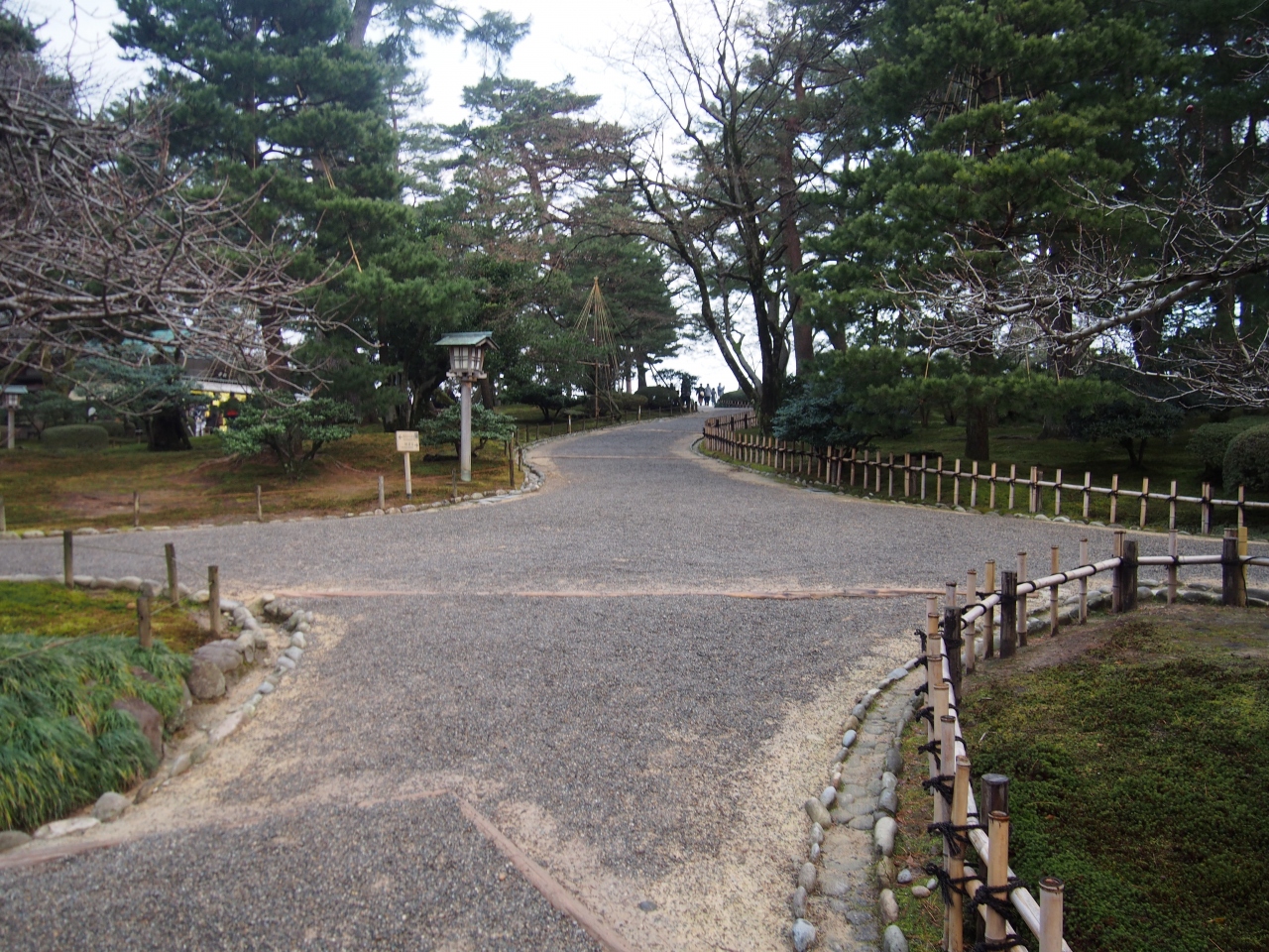 兼六園の南西側の出入り口から瓢池、夕顔亭へと向かうゆるやかな坂道が真弓坂です。幅広い土、砂利の道でまわりには大きな木々が植わっており、途中は特に見るべきものがないので、のんびりと歩いて行けます。観光客も東側に比べて少ないようでした。真弓の坂の名前の由来は5月の下旬に花をつける真弓からきているそうです。