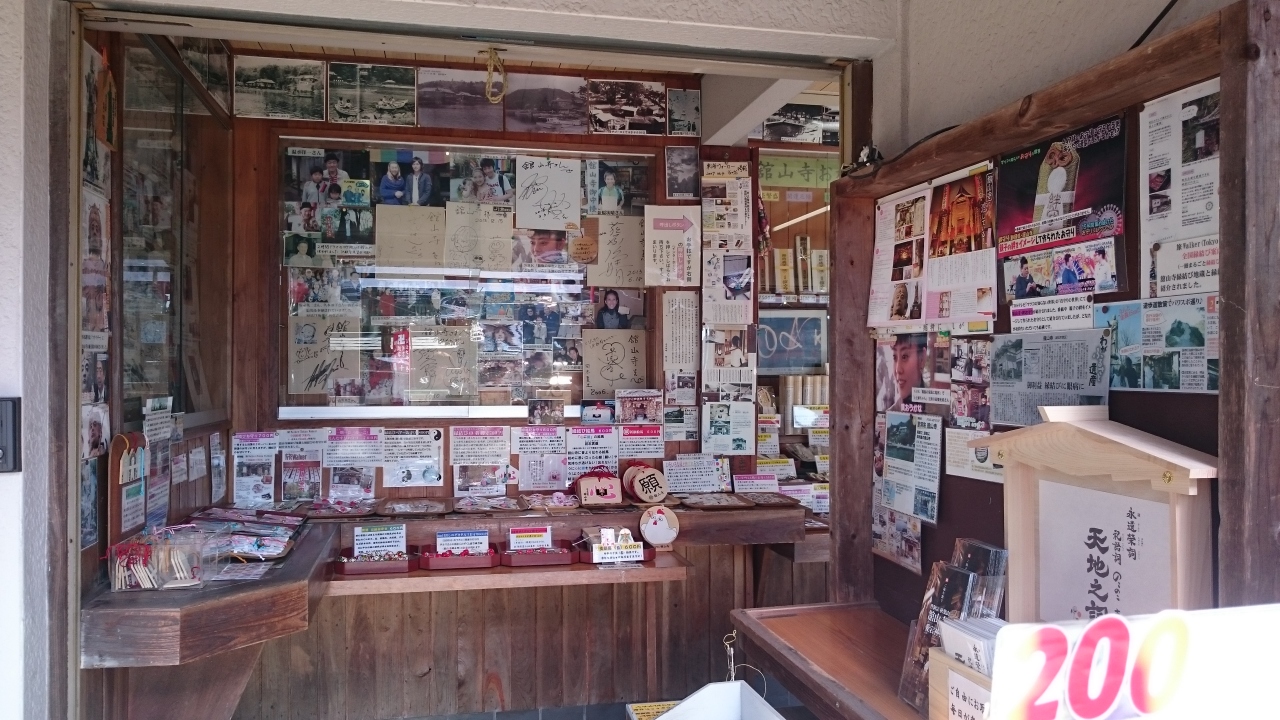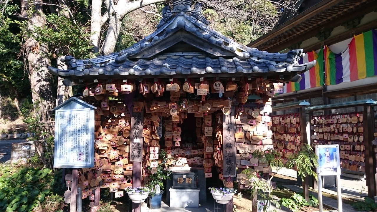 取材に来た有名人の写真が飾られている御守授与所で500円の絵馬を買って、近くの縁結地蔵尊のお堂に収めてきました。