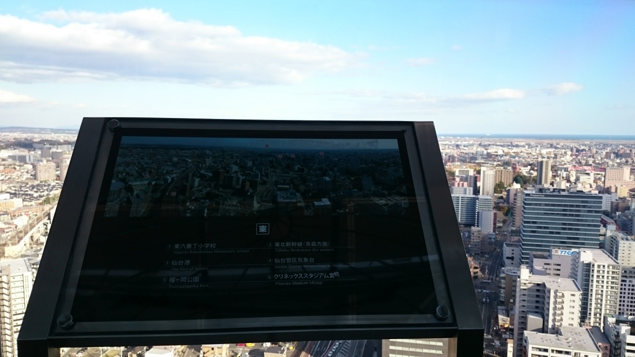 パルコの隣のアエルの最上階にある展望台(デッキ)です。あまり広くはありませんが、無料で見学できます。同じフロアに結婚式場(レストラン)が入っているので見える景色は限られますが、海が見渡せます。別方向からは泉方面も見ることができます。