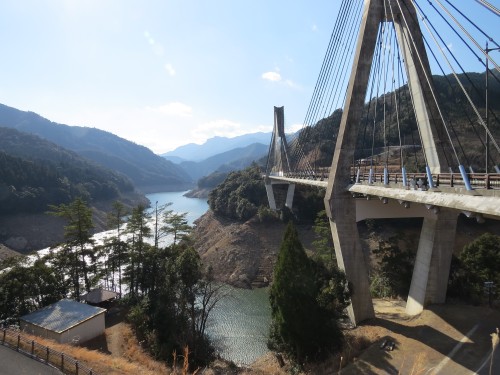 道の駅宇目の駐車場からダム湖の景色を楽しみました。ダムの上には唄げんか大橋が架かっており、ダム湖と橋とが周囲の景観にうまく溶け込み、大変きれいな眺めでした。美しい景色を眺めているうちに旅の疲れが癒えました。