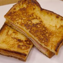フレンチトーストで、ハムとチーズを挟んだもの(したがって、手で持って食せない)。粒マスタードを隠し味としている。