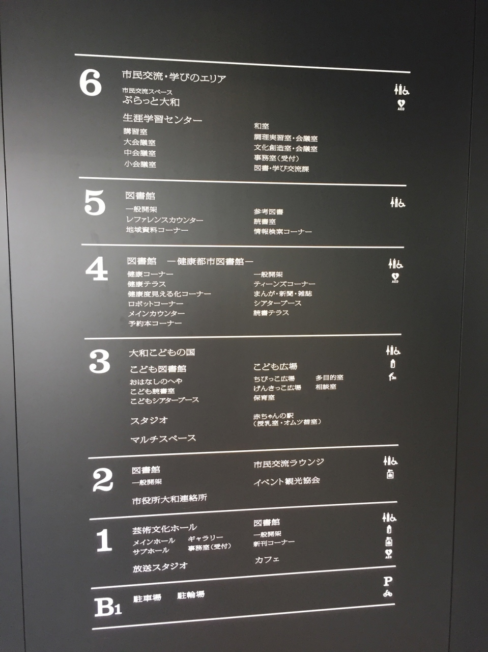 大和駅から徒歩で4分くらいの場所にあります。市街地再開発事業により造られたビルに市民会館などと一緒に入居しています。5フロアに渡る図書館は開放的で多くの客がいました。特に椅子と机がある場所には、受験生らしい学生が懸命に勉強していて、ほとんど空いている席が見当たらなかったくらいです。