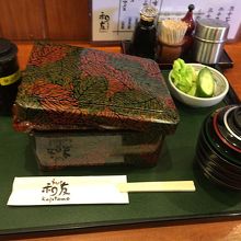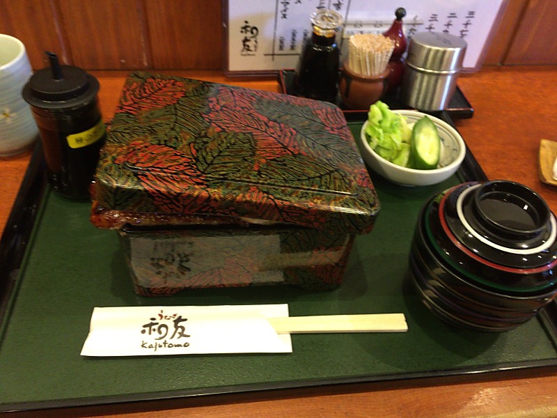 こちらの人気メニューはうな重、鰻が収まりきらずに蓋が浮いてます。