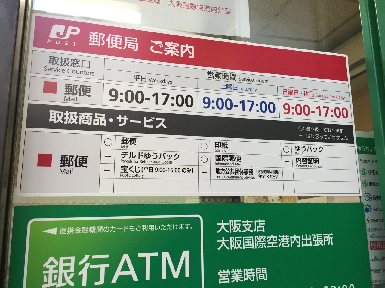 伊丹空港に郵便局があるのを最近知りました。土日も9時から17時まで空いているので本当に便利です。場所は1階の真ん中辺りで、モスバーガーを目印に行けばすぐに分かりますよ。リムジンバスを降りた所です。コンビニもあるので ここは便利なエリアです。