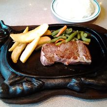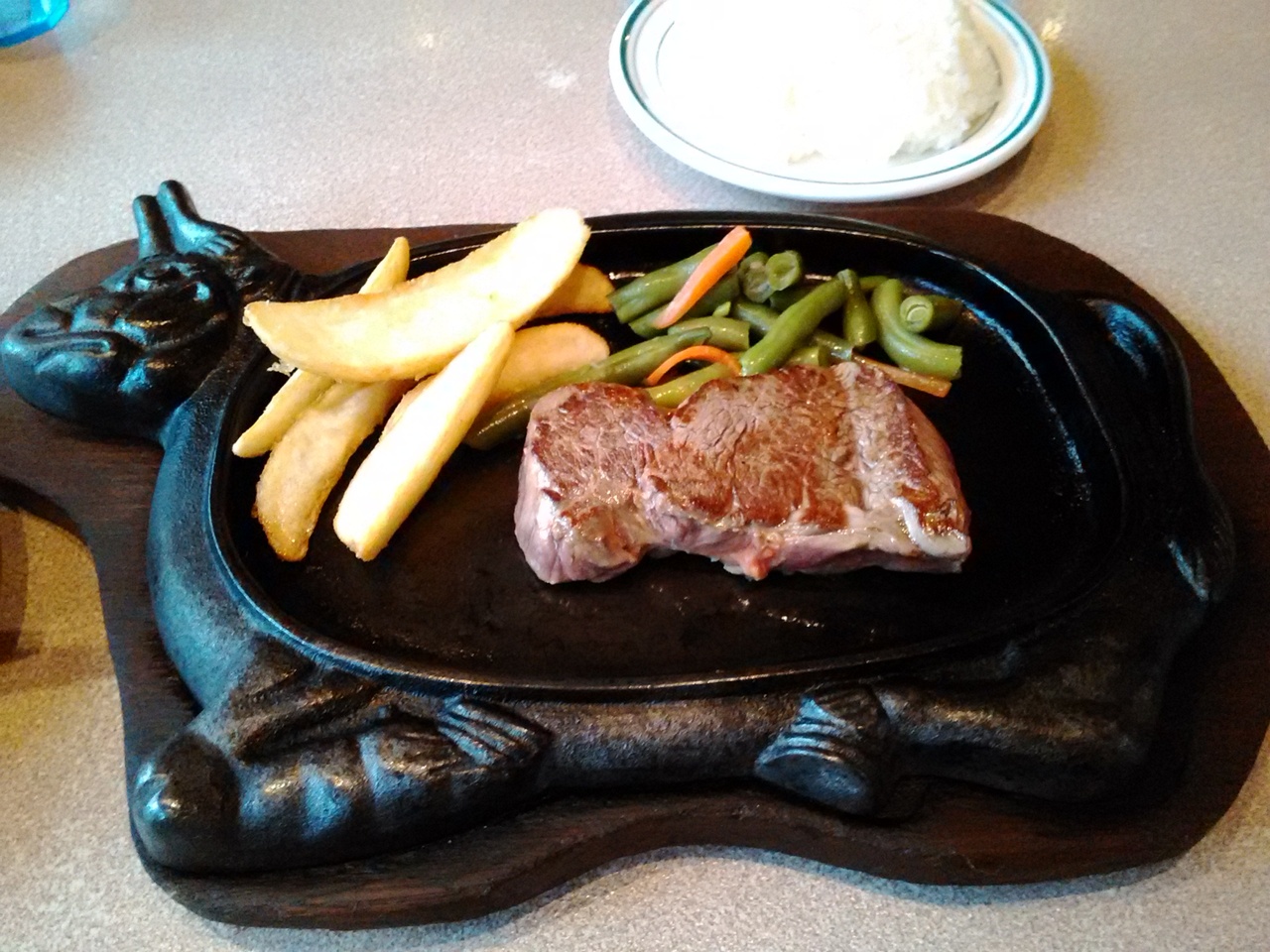沖縄4回目にして念願のステーキをいただくことができました。注文したのはテンダーロインステーキS(100g、スープ、サラダ、ライスorトースト付き)、税込1728円。このお店の中では一番リーズナブルなメニューです。お肉はやわらかく美味しかったですが、付け合せの野菜などはいかにも業務用冷凍食品的なものではなくもう少しちゃんとしたものならと少しがっかり。オススメされたソースはジンギスカンのたれっぽくて、塩でいただいた方が美味しかったです。