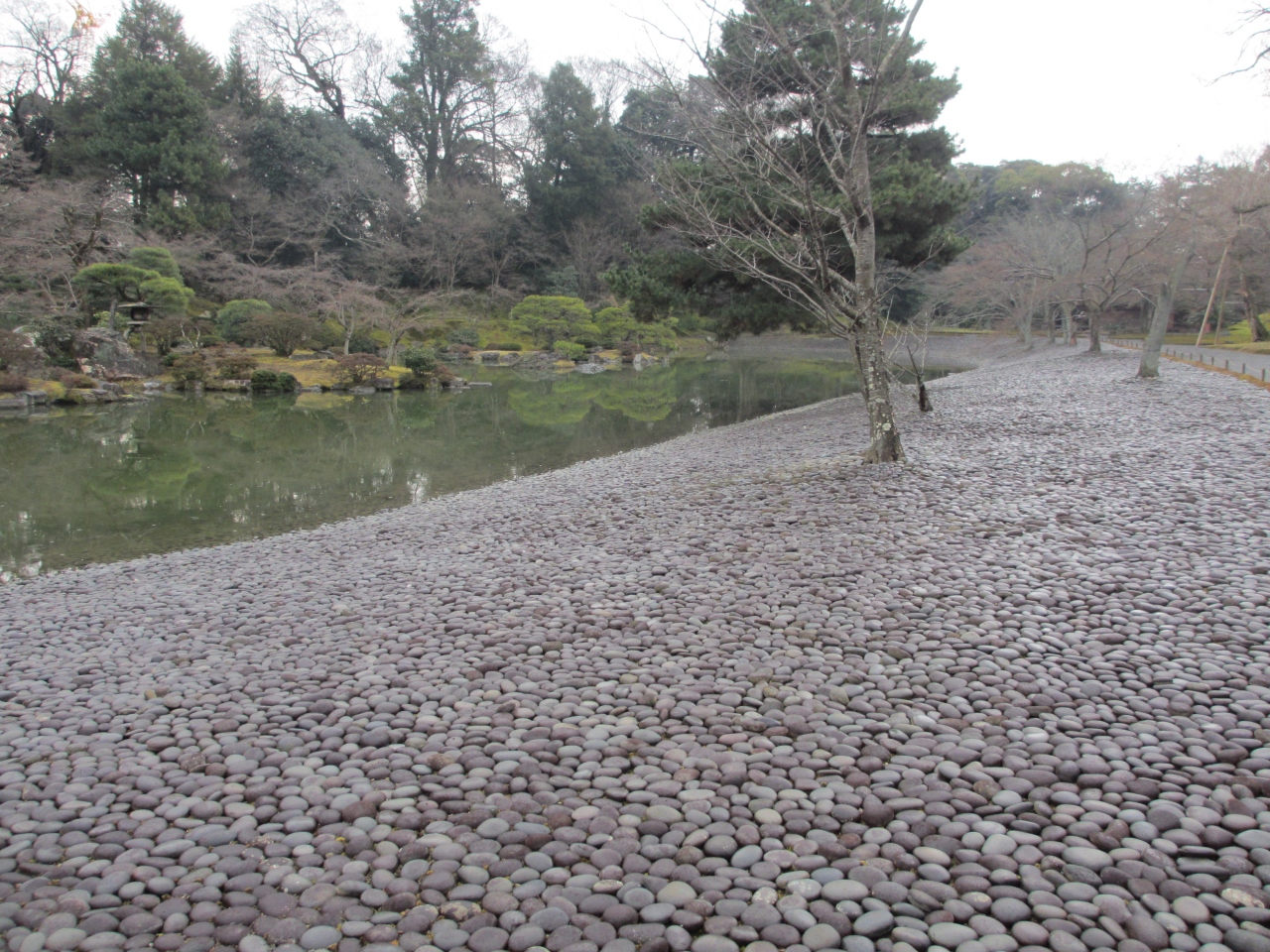 後水尾天皇が退位後に住まいとしたところです。火災で建物は焼失してしまいましたが、立派な落ち着きある苔が美しい庭園が残っています。当時の姿を保存し続けていくため、3か月前から郵送やインターネットで申し込みしなくてはなりませんが、今回は1か月前に急遽、京都行が決まったにもかかわらず、ネットで申し込みしたところ許可され見学してきました。2年前に訪れた修学院離宮も1か月前に申し込み許可されましたが、冬は希望者が少ないのか許可されやすいようです。御所内は1時間ほどかけて説明してもらえます。