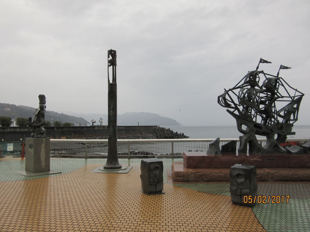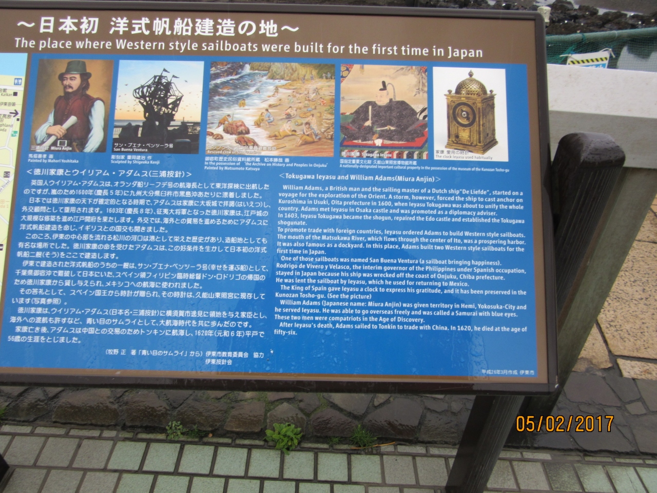 松川河畔を歩いて海辺に着くと小さな公園があり像が建っていた。三浦按針(青い目の サムライ)と呼ばれ徳川家康に認められ外交顧問として活躍した人物。特に伊東で