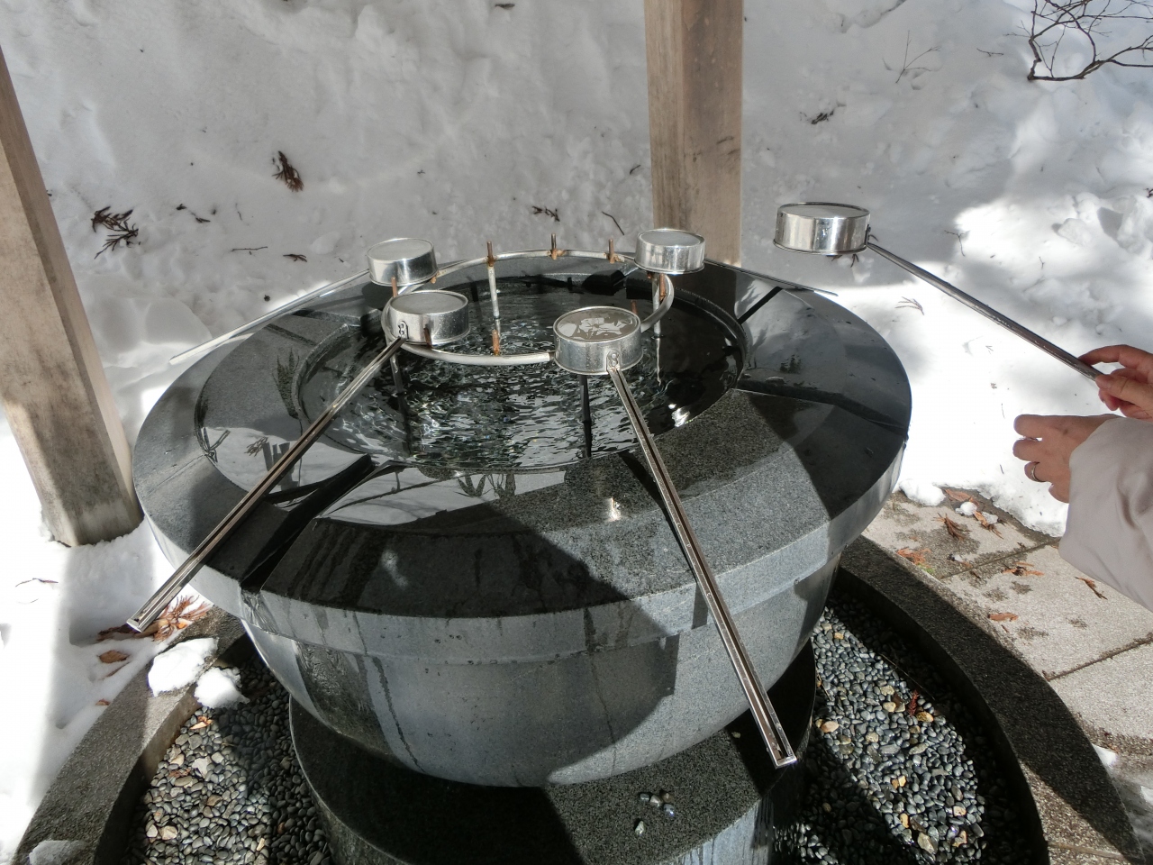 手水舎や社殿はすっかり雪をかぶっており、青空の下、少し神秘的でした。