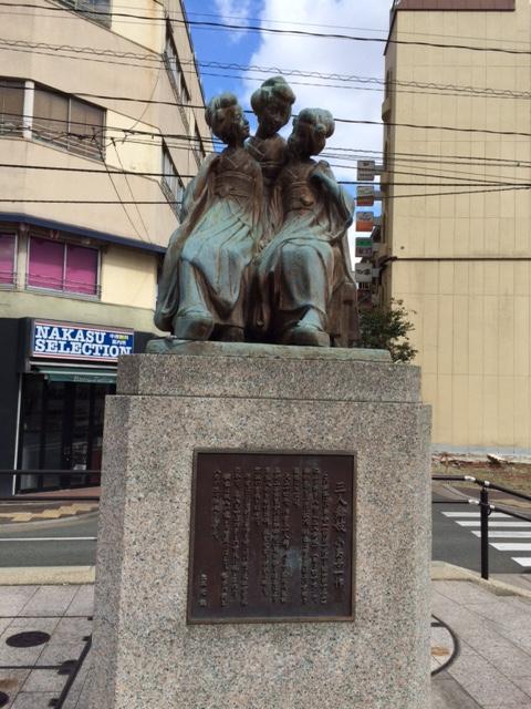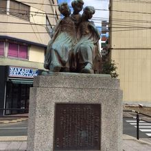 天神と中州の間を流れる那珂川に架けられた出会い橋の中州側のたもとにある銅像です。