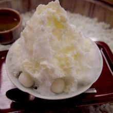 器に小豆(丹波大納言だという)を盛り、その上にかき氷を乗せ、練乳をたっぷりと掛け、白玉を添えている。
