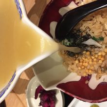 麺を食べ終わった後、店員に声をかけスープを鉄球で温めて貰った後、ご飯と頂きます。