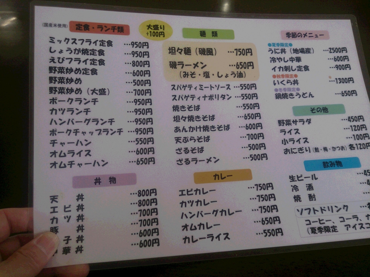泊村の国道229号線に面したレストハウス兼レストランです。泊村でご飯を食べようとしたとき、ここともう一軒しか選択肢がありません。したがって、仕方なくここに入りました。宿泊施設もあるということで、だだっ広い食堂です。50人くらいは入れそう。メニューは豊富です。観光客相手の「うに丼」や「イカ刺し定食」から地元の人向けの「ラーメン」「カレー」に至るまで何でもあります。目に留まったのが「ポークチャップランチ」950円。ケチャップで味付けた焼いた豚肉ということで、これを注文。出てきたのは、厚さ3センチはあろうかという超ビッグな豚肉。切るのも大変でビックリのボリュームです。味は、少し濃いものの、ご飯が進む良い味でした。仕方なく入った店が、大正解でした。