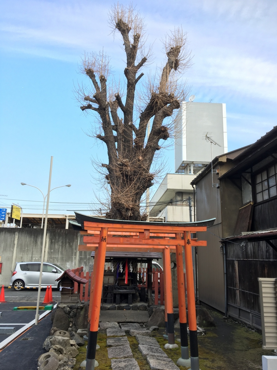 観光地図にあったので見学しようと随分探しました。わかりやすそうで、わかりにくいところにありました。市場の小さな道路を挟んだ南側の駐車場の角に窮屈そうにありました。神木らしく、木の前に祠と鳥居がありました。