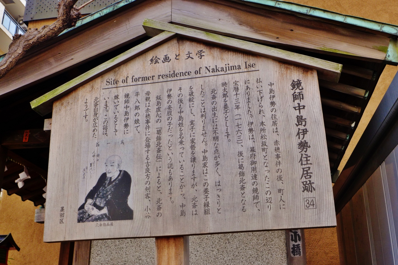 神社の脇に案内板がありました。それによると中島伊勢という人は幕府用達の鏡師だったそうで、葛飾北斎を養子としたそうです。