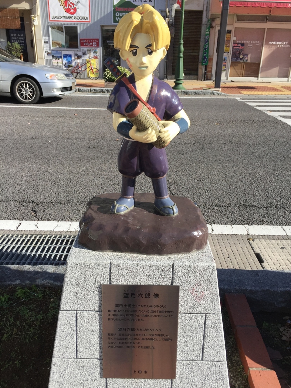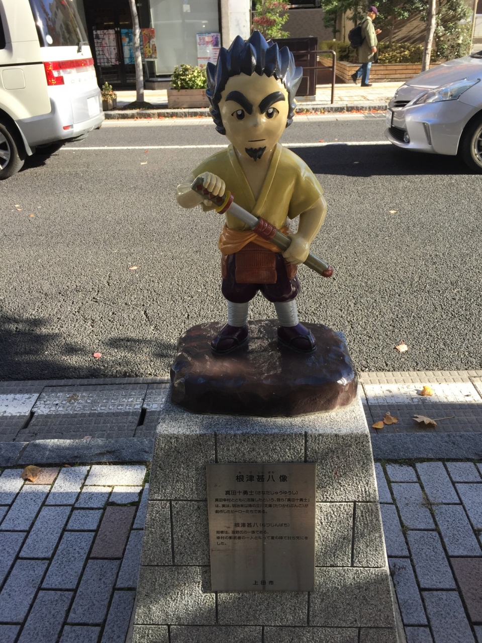 上田の街を歩いていると、いくつかのモニュメントに遭遇します。根津甚八像は柳町から駅に戻る途中にありました。これらは、平成25年に設置されたので、まだ新しいです。