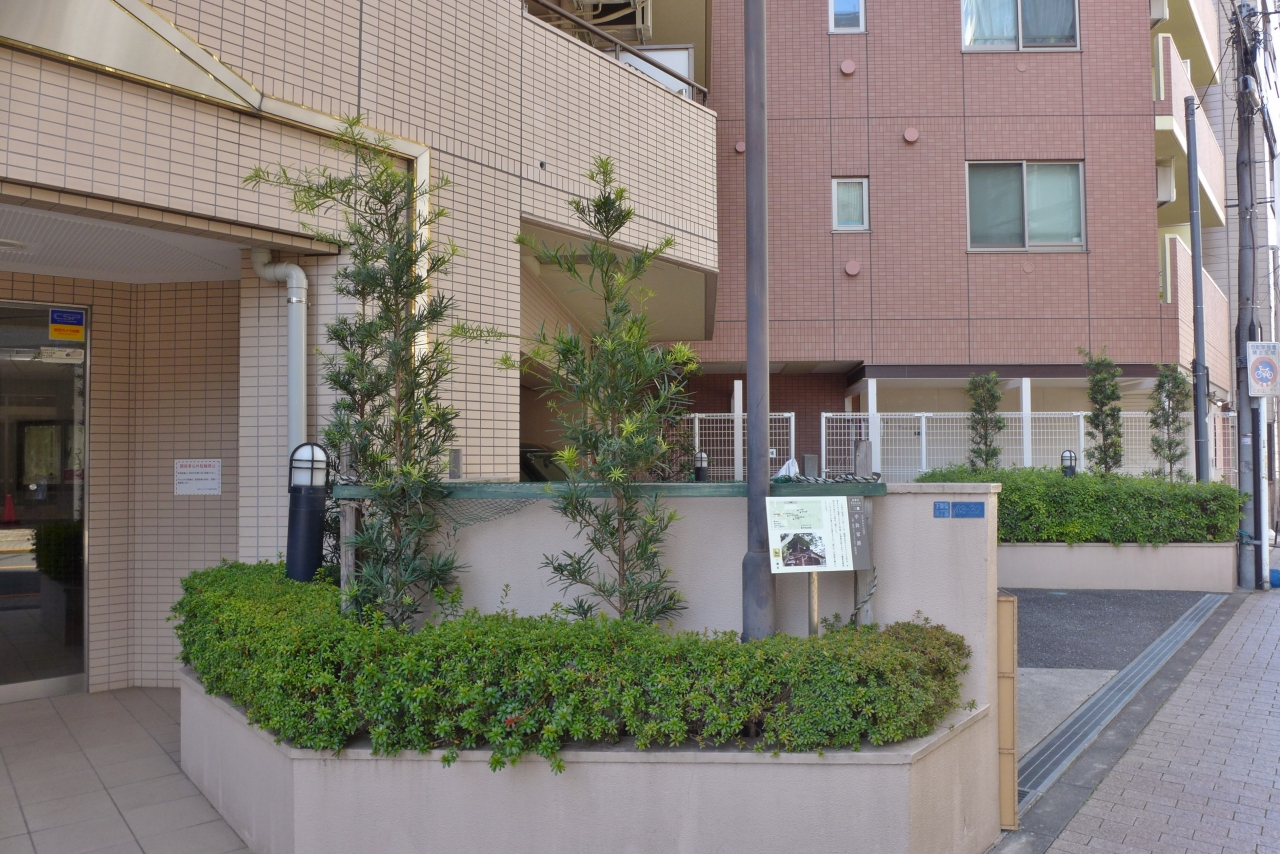 JR三鷹駅の南口から斜め右手に延びる通りを進み、最初の交差点「三鷹駅前郵便局」を右折するとすぐ左手のマンション前に案内板がありました。