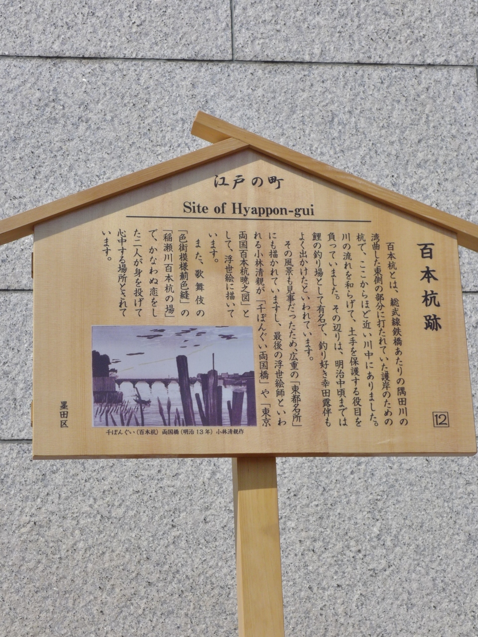 百本杭は隅田川の護岸を浸食から守るために打たれた多くの杭のことで江戸時代から明治期までその姿が見られたそうです。