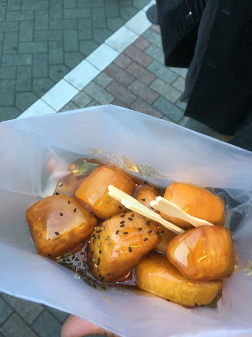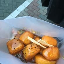 美味しそうな匂いにつられてついつい購入してしまいました。積み上げられているお芋そのままかと思いきや、袋に詰めて更に上から蜜がかけられました!