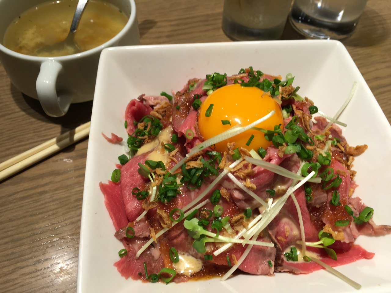 休日にランチの時間帯に行きました。ランドマークの地下2階という場所柄なのか、とても空いていました。オープンキッチンのカウンター席でした。オーダーしたローストビーフ丼はソースと卵黄がマッチして美味しかったです。肉料理がメニューにたくさんあり、ハンバーグやステーキも美味しそうでした。