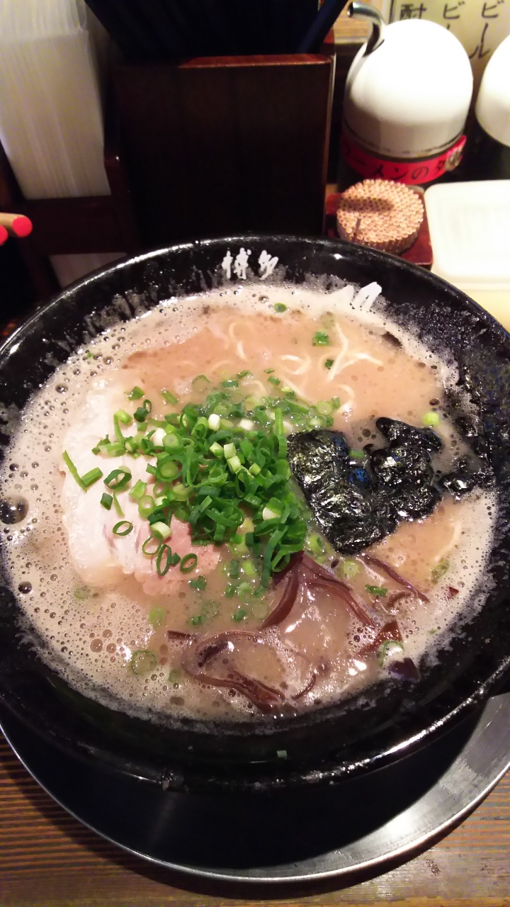 飛行機の中で弁当を食べ中途半端な時間帯だったので、シンプルにらーめんを注文。博多のラーメンは思いのほかスープがサラッとしているが、こちらは東京でもよくある若干の粘度があるクリーミー系。店内に豚骨臭がするのはしっかりスープを炊いている証拠だろう。麺はパキパキとした博多ラーメンらしい細麺で、濃厚なスープに合う。なんだかんだであっという間にたいらげて、思わず替え玉を注文してしまった。