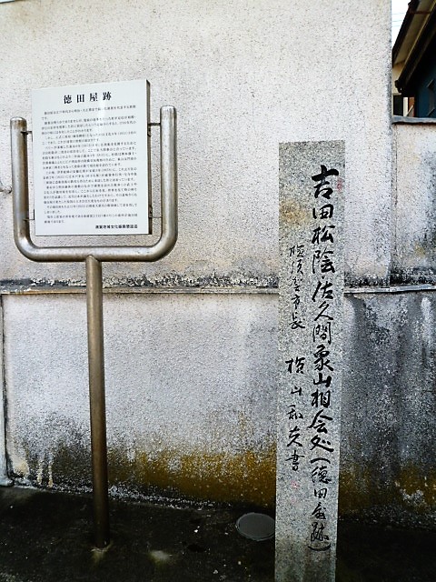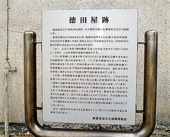 `浦賀の渡し`に乗って西浦賀から東浦賀まで着くと(偶然ですが)掲示板`徳田屋跡`と碑`吉田松陰,佐久間象山`を見付けました。「エッ あの二人がここで?!」と思いました。掲示板を読んでみると`徳田屋`には、二人+`安藤広重!,桂小五郎!`等が泊ったとありました(^o^!) 浦賀にはあの黒船が停泊してたんだ!