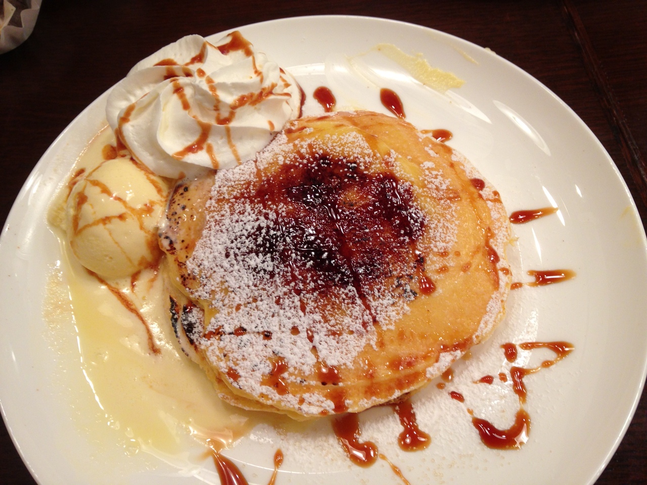 休日の午後のカフェ利用。とても混雑してました。パンケーキブリュレを食べたくて行きました。カスタードクリームを挟んで上にカラメルソースをかけたパンケーキです。クリームブリュレのように、パン生地の上でカラメルソースがパリパリしていました。メープルとココナッツソースがついていて、これもまた美味。