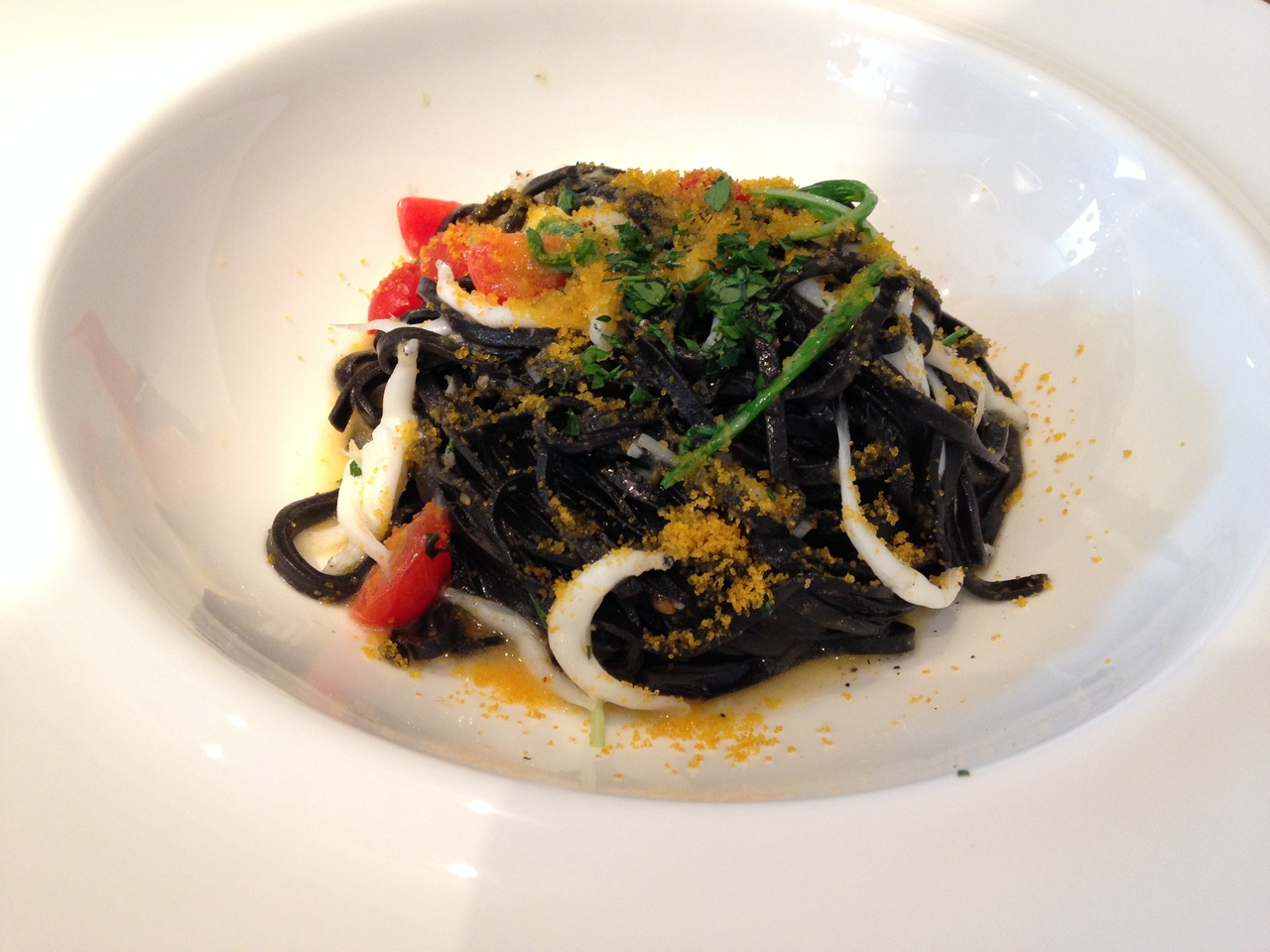 平日のランチタイムに行きました。銀座の三越という場所もあってか、ランチの早めの時間でしたがすでに混んでいました。予約なしでしたが、席を案内してもらえました。イカスミのパスタはパスタの生地にイカスミが練りこんであり、イカスミのしつこさがなくとても上品な仕上がりでした。