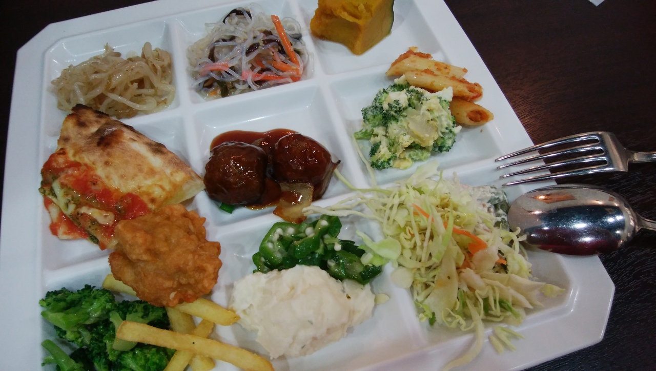 ピザ、スパゲティ(味は日本風)、カレー、おでん、天ぷら、唐揚げ、コロッケ、ポテトフライ、うどん(温、冷)、生春巻き(錦糸卵、きんぴらゴボウ、ニンジン、キュウリ、シソ、春雨を自分で巻く)、白飯、サラダ、デザート、手作り豆腐、ドリンク等がありました。個人的には品数は少なく感じました。