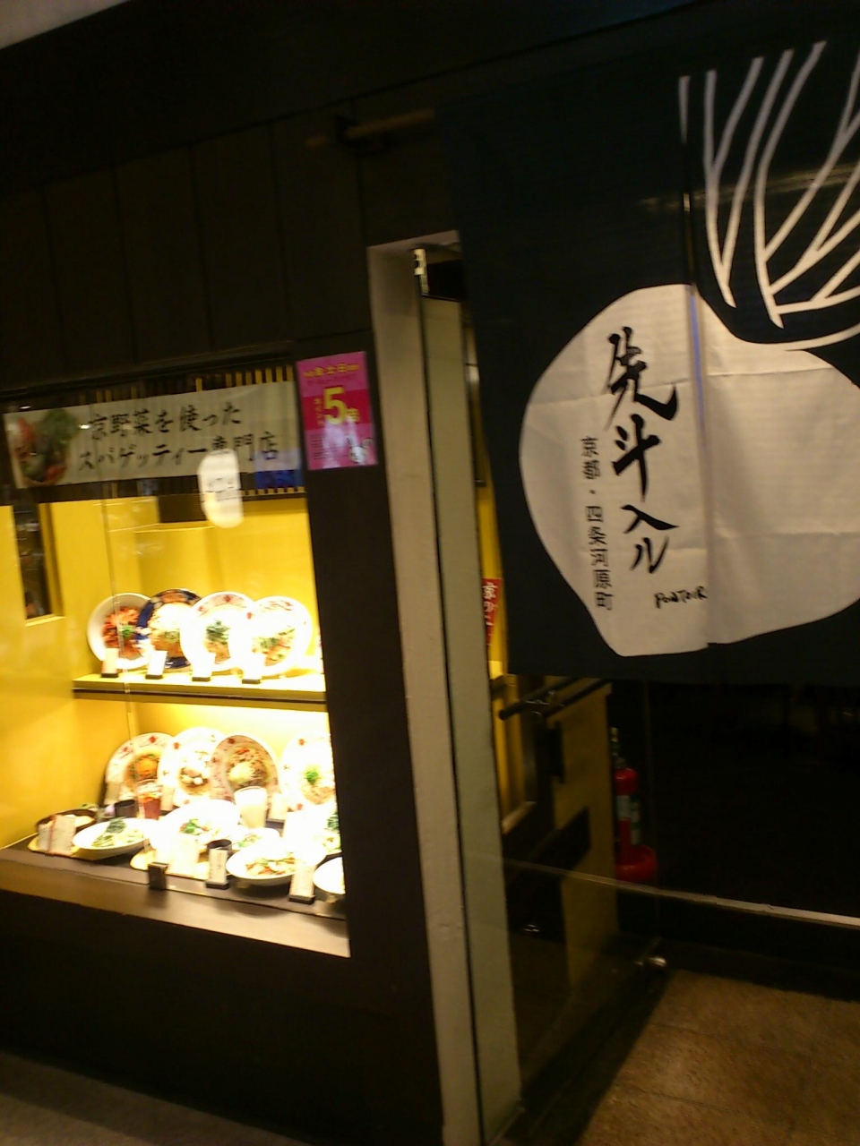 京都の駅ビルの11階のTHE CUBEというレストラン街の中にあるパスタ屋さんです。何か京風のものが食べたかったので、京風スパゲッティという名前につられて入店しました。トマトソース系もありましたが、折角なので醤油風味の和風スパゲッテイを注文しました。フォークではなくて、お箸が置いてあります。京野菜を使った醤油ソースのスパゲッティは、予想以上においしかったです。