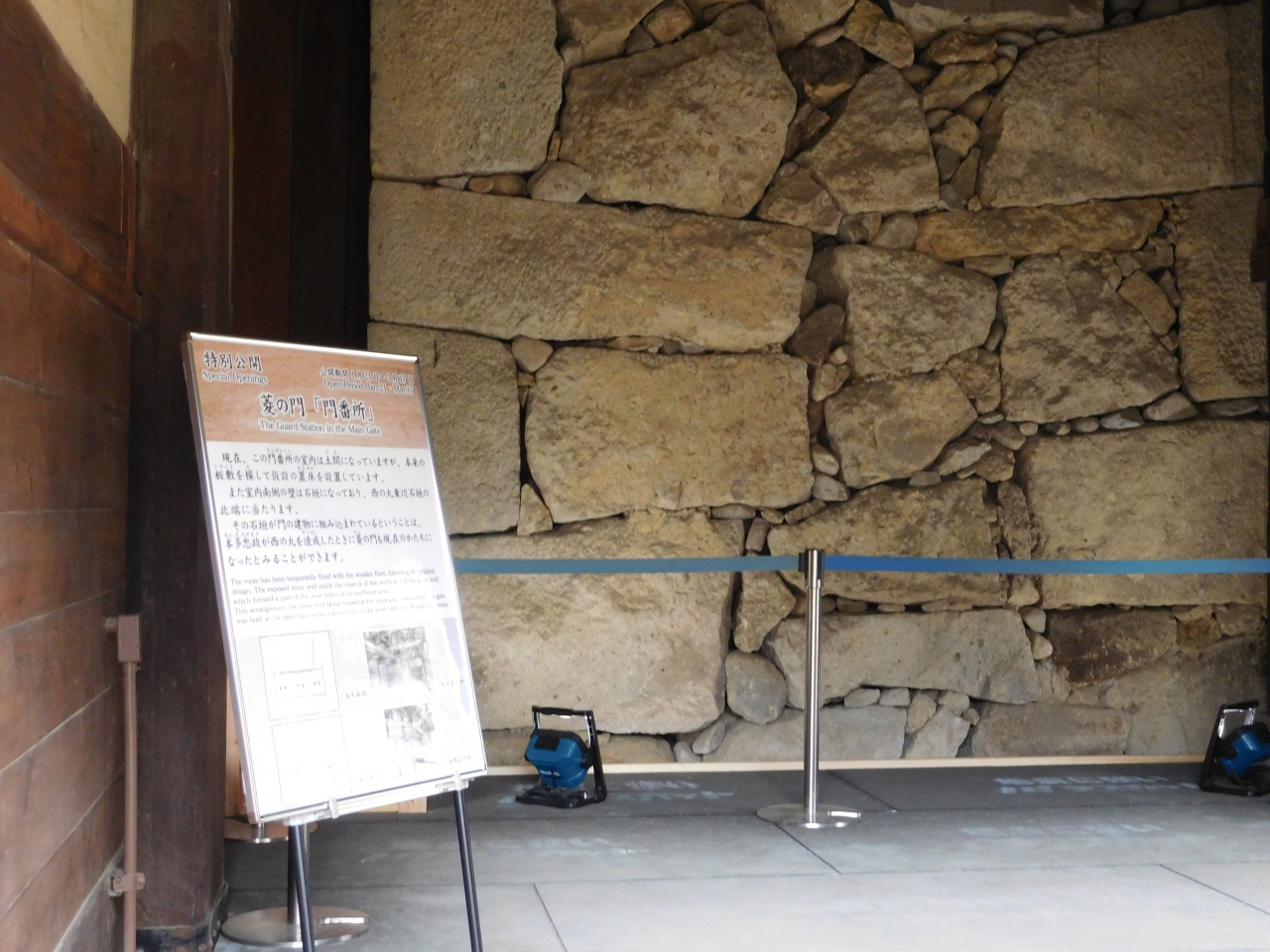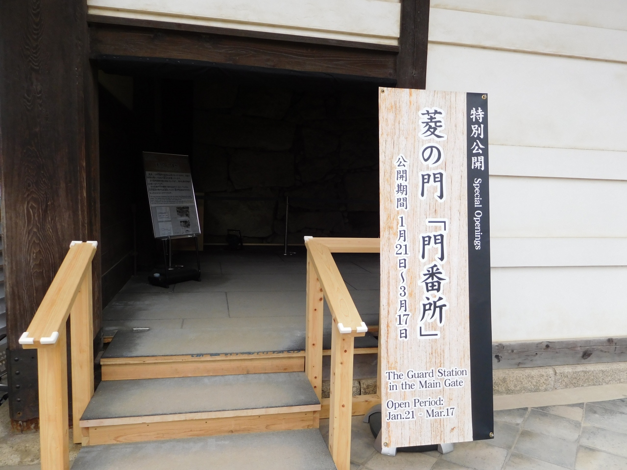 姫路城の正面玄関にあたる城門で、とても立派な門です。姫路城が一般公開されるようになってから約100年経っていますが、この門の内部が公開されるのは初めてのようです。(特別公開は、約2か月のみの限定のようです。)「門番所」と書かれた入口を入ると、門の中に石垣が組み込まれているのが不思議な感じでした。公開部分の見学はあっという間でしたが、ちょうど良いタイミングで訪れる事が出来て良かったです。