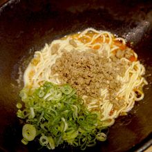 一般的な汁なし坦々麺は、タレに様々なスパイスを使って風味を出しているが、当店のは白味噌と胡麻を使っているのが特徴。
