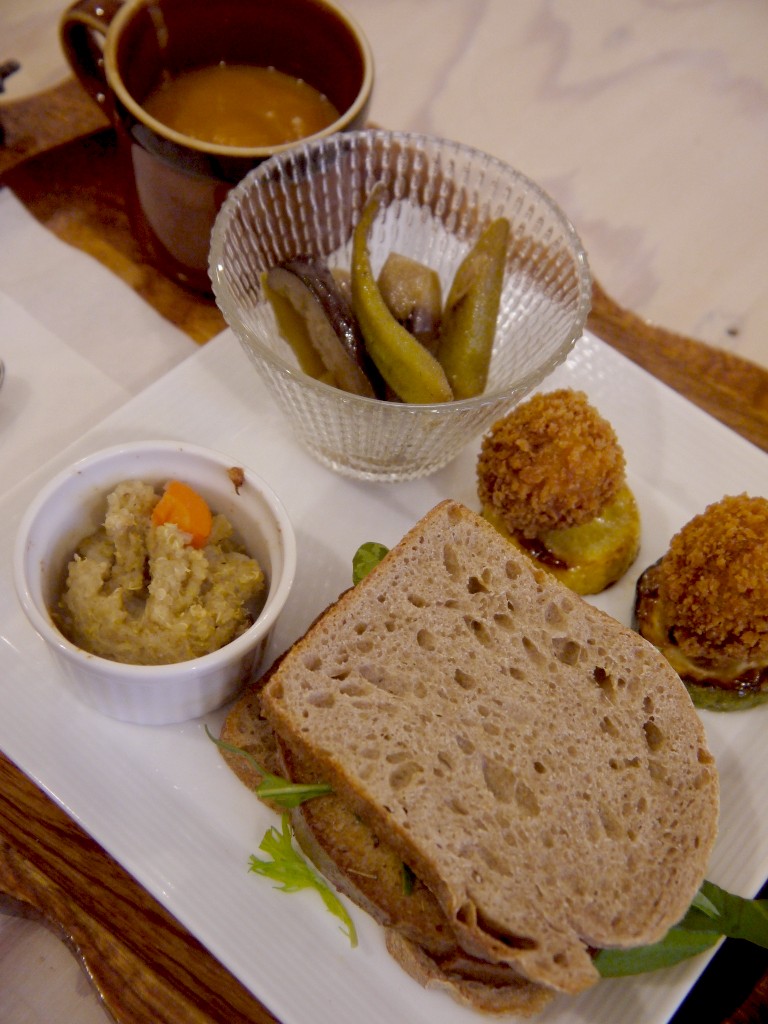 冷製トマトスープ、夏野菜の焼きびたし、ひよこ豆のコロッケ、キヌアのリゾット、車麩サンドから成る。