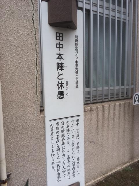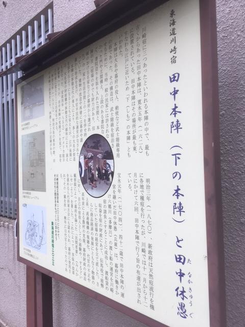 江戸時代、川崎宿には三つの本陣がありました。多摩川に最も近いこの田中本陣は「下の本陣」とも呼ばれており、あとの二つは「中の本陣」「上の本陣」と呼ばれていました。つまり、京に近い方から、上・中・下と名付けられているのです。この田中本陣跡、今は何も残っていませんが、同じ場所に、この本陣を営んでいた地元の名士、田中休愚の説明板がありました。彼がいかに地元に貢献したかが記されているので興味深く読みました。