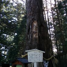 樹齢600年といわれる杉の樹でうろができている場所にしめ縄がありそこに向かって願いをかけるとかなうと言われています。