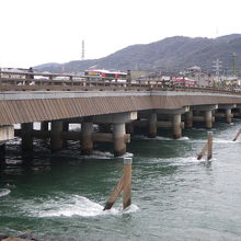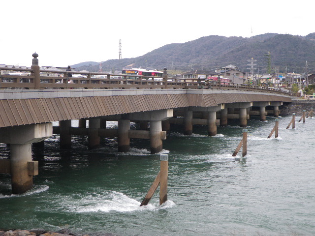 平等院鳳凰堂から源氏物語ミュージアムへ行く途中、宇治橋を渡りました。長さは200メートルほど、歩幅は3メートルほど、橋の真ん中あたりに宇治川や街並みの写真等が撮れるスペースあり。平等院側に紫式部の石像あり。