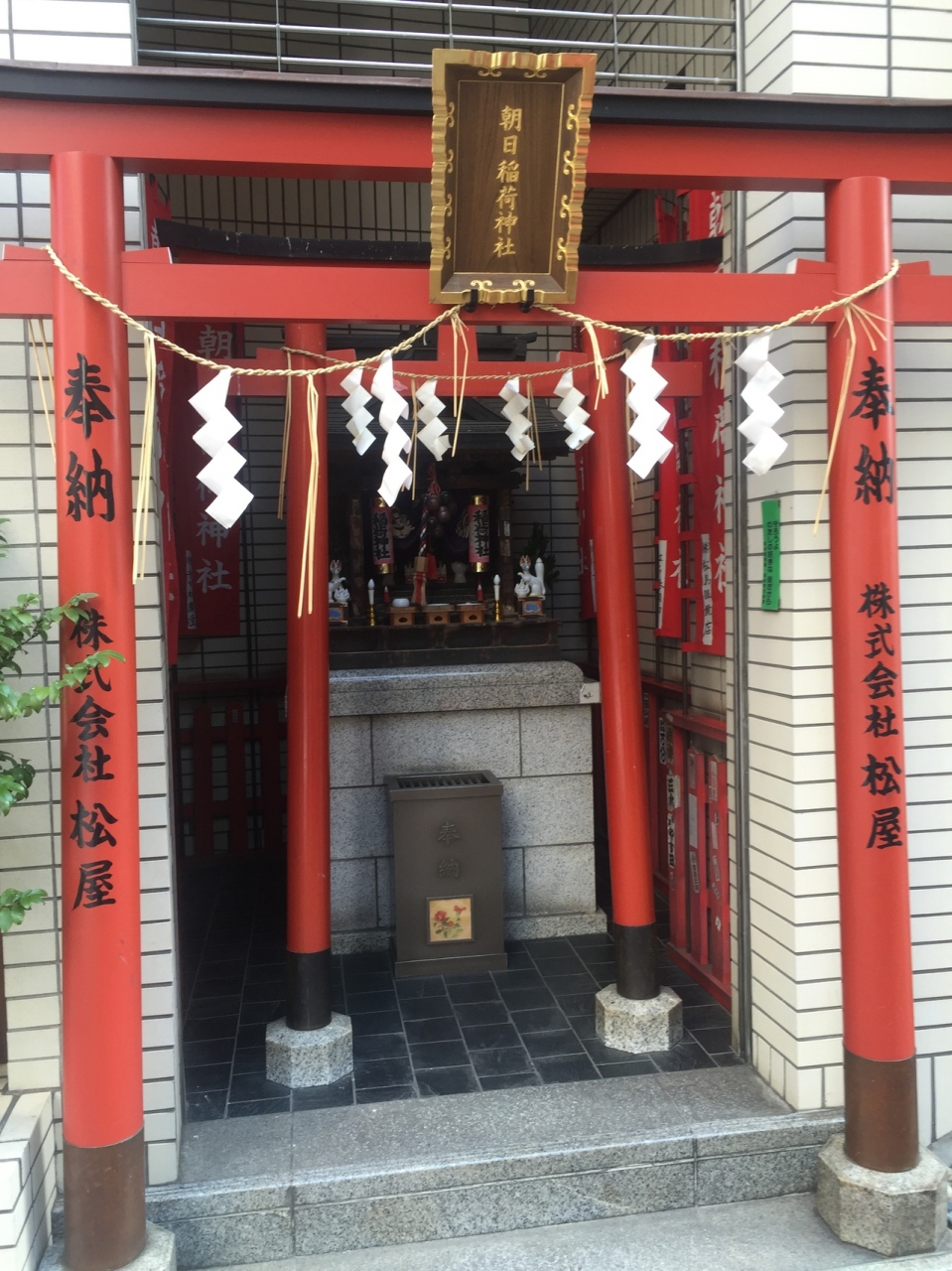 銀座駅からホテルモントレに向かって歩いているときに見つけました。松屋の文字があったのでお金を出しているんですね。銀座八丁神社めぐりの一社です。かなり小さな神社で、神社と呼んでいいのかと思うぐらい小さいです。
