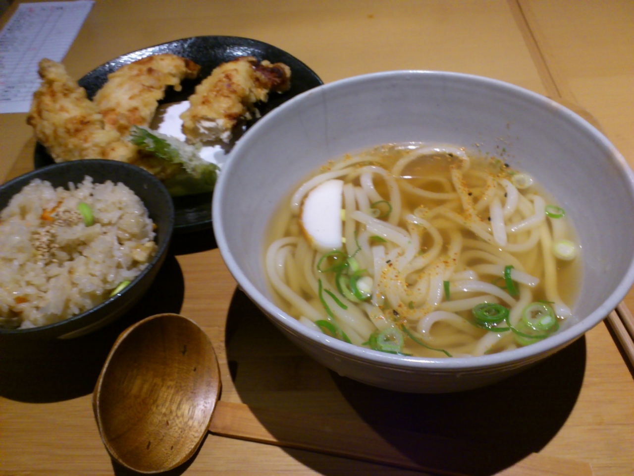 宇治尿道院に行く前にランチを食べるお店を探していて見つけました。宇治橋通り商店街の中にあります。靴を脱いで、お店の上に上がります。個室のようなテーブル席に案内されましたが、奥には掘りごたつの席もあるようです。鶏ささみ天付きのうどんを注文しました。天ぷらはうどんには載っておらず、別皿で出て来ました。大きな3つの鶏ささみで、とても食べ応えがあり、それも美味しくて大満足です。