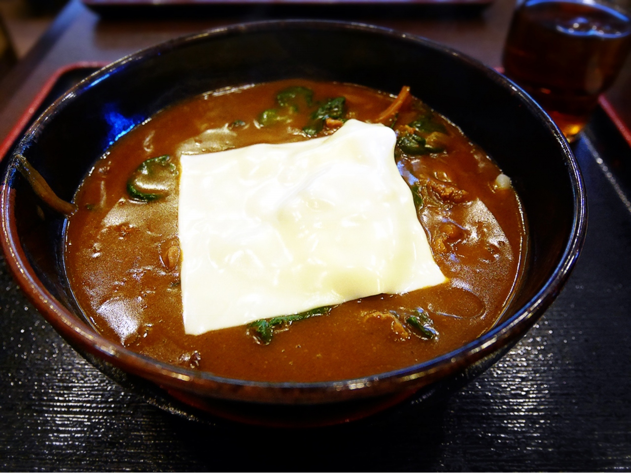 運ばれてきたカレーうどんは、ドロリとしたタイプで、寒じめされたほうれん草とチーズがトッピングされています。