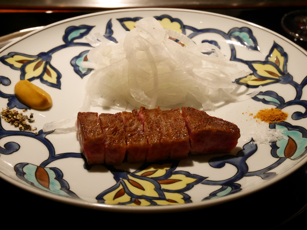 特選うかい牛では無く、黒毛和牛。産地はうろ覚えですが、宮城か宮崎だったかと。肉質は、感動レベルまでは到達しませんが、勿論美味しいです。付け合せは、オニオンスライスのみ。欲を言えば、折角の鉄板焼きなので、原価の安い野菜でも良いから、焼いて頂きたかった。