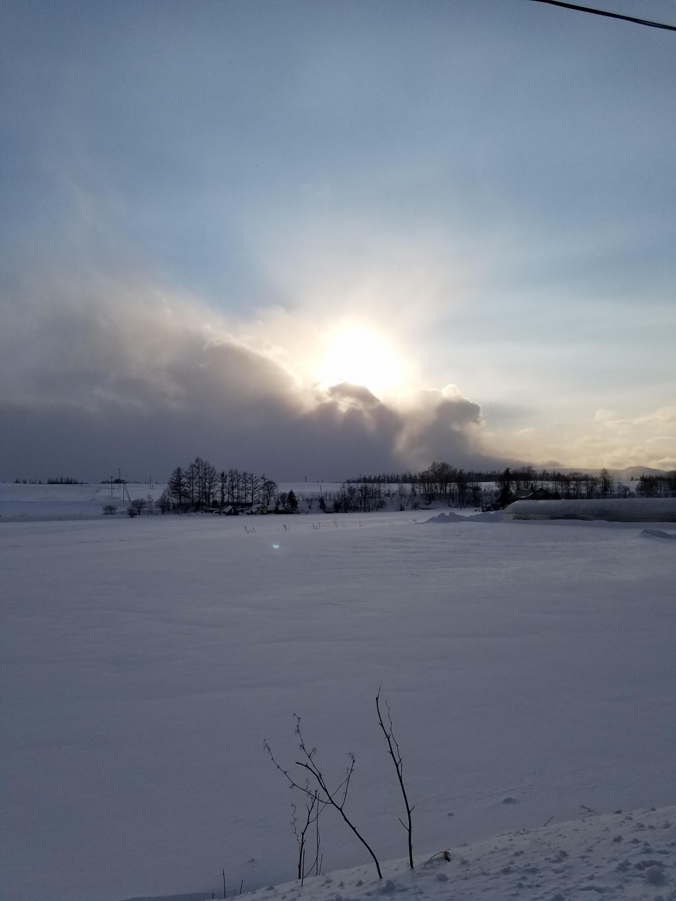 パノラマロードは、美瑛の代表的な景色、なだらかな丘陵地帯と山並みの雄大な自然を見ながらドライブを楽しめます。冬の夕暮れのドライブ、雪ですべてが白一色に覆いつくされた景色が広がるなか、雲間から日差しが雪原をオレンジ色に照らす光景は、とても感動的でした。